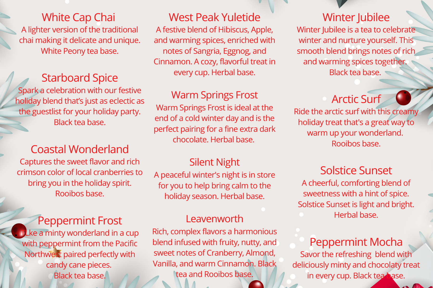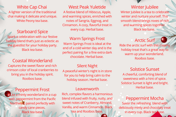 Every blend offers a unique taste of winter magic, from spiced and fruity flavors to rich and creamy notes. Perfect for sharing with loved ones or enjoying solo by the fire, this collection is sure to make your holidays a little cozier and a lot more flavorful.